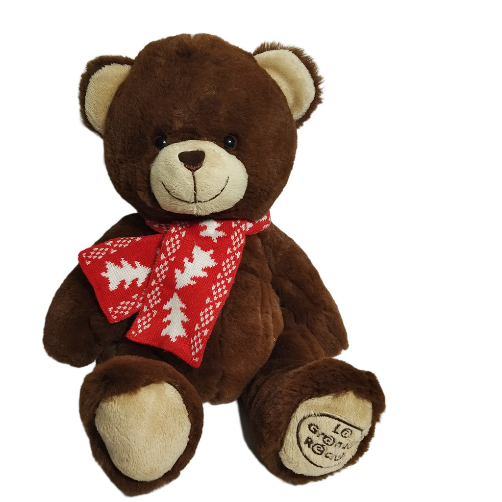 Barna ülő maci plüss, karácsonyos sálban 26 cm / La Grande Récré