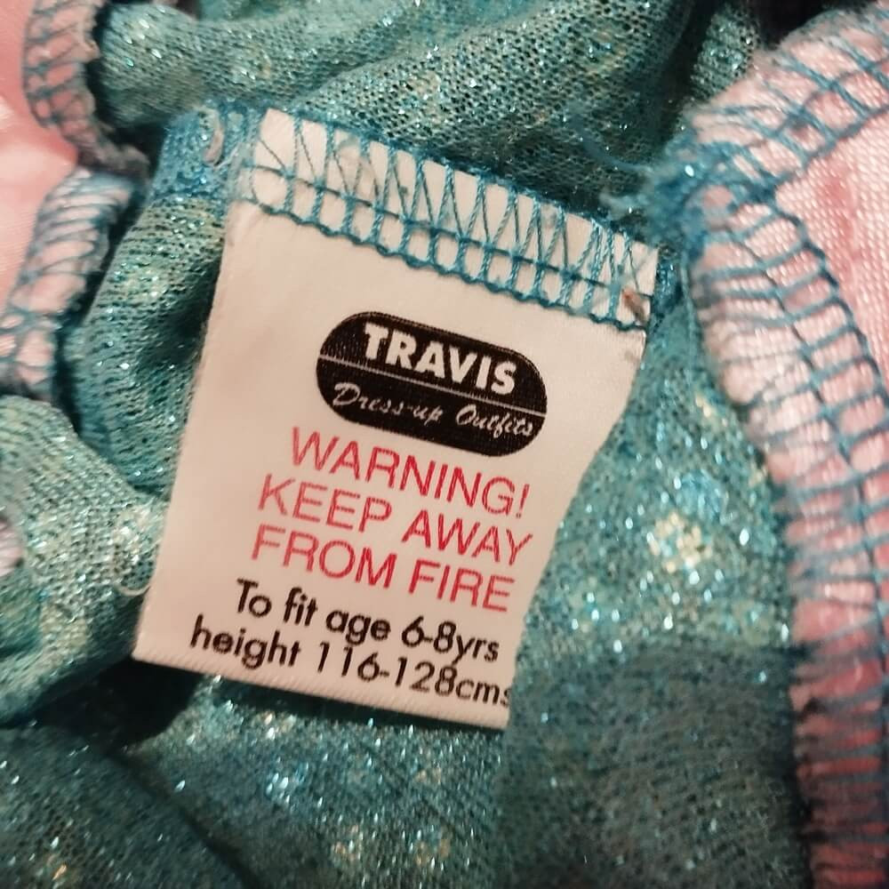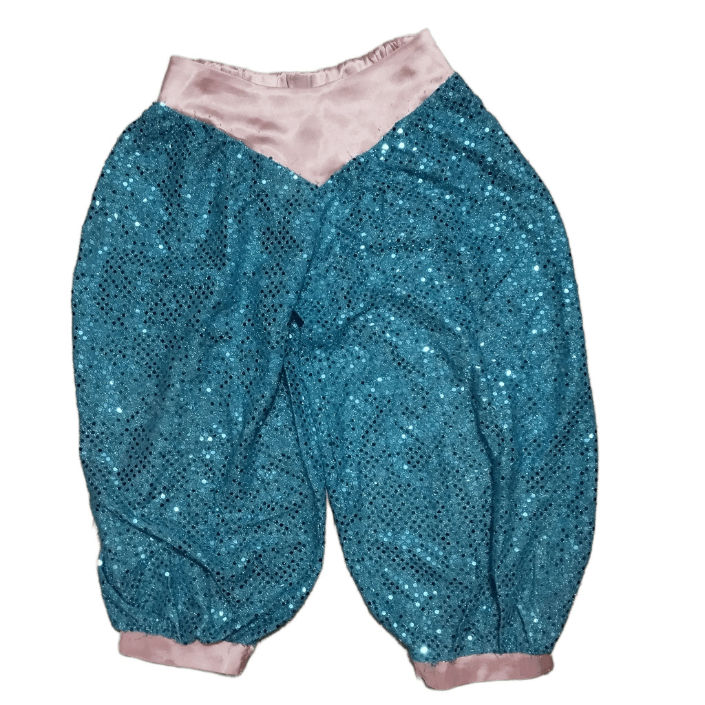 A nadrág csillogó, türkizkék színű.
