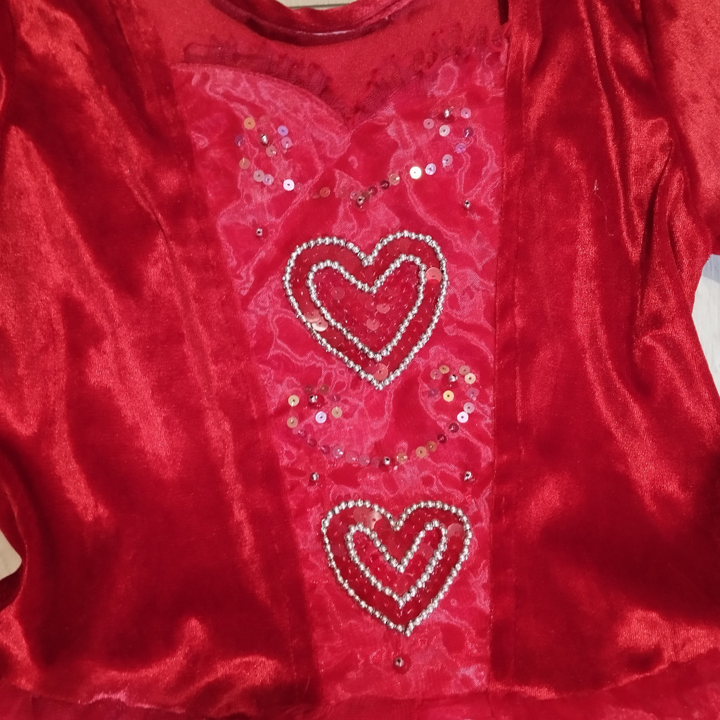 Eleje gyöngyös szívekkel, fliutterekkel van díszítve.