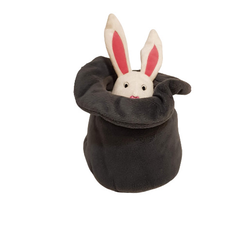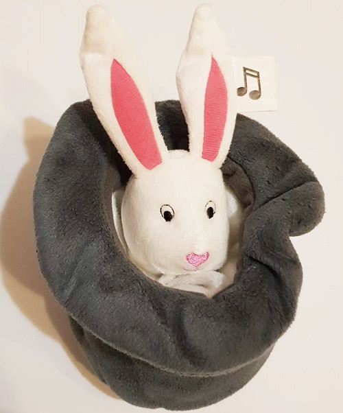 A kalapból a nyuszit felfelé húzod/kalapból kihúzod/ és baba altató dallamot játszik.Címkéje már nincs rajta.