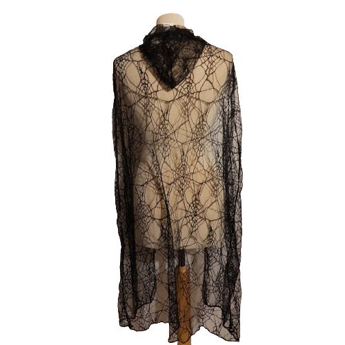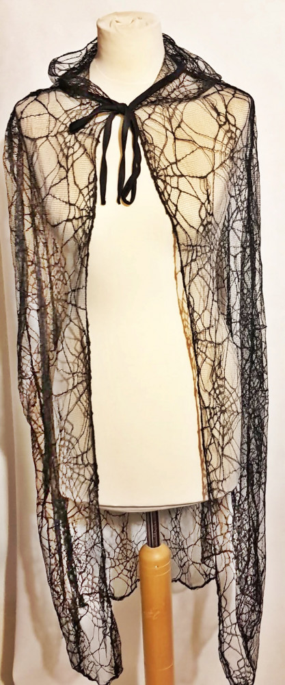 Fekete színű, átlátszó jellegű, pókháló mintás kapucnis köpeny.