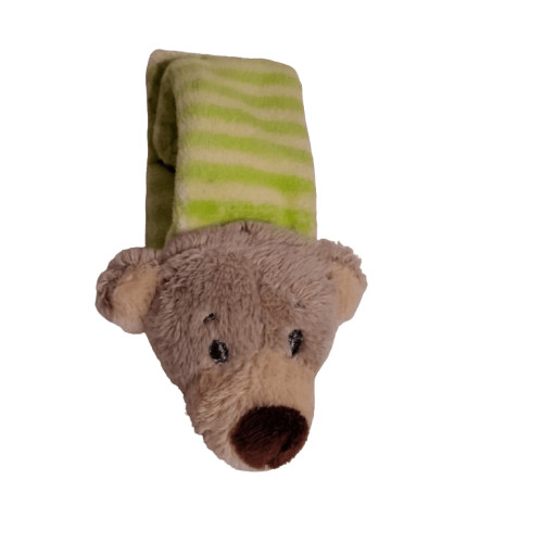 Plüss mackó fejjel díszített csuklópánt vagy baba csörgő.