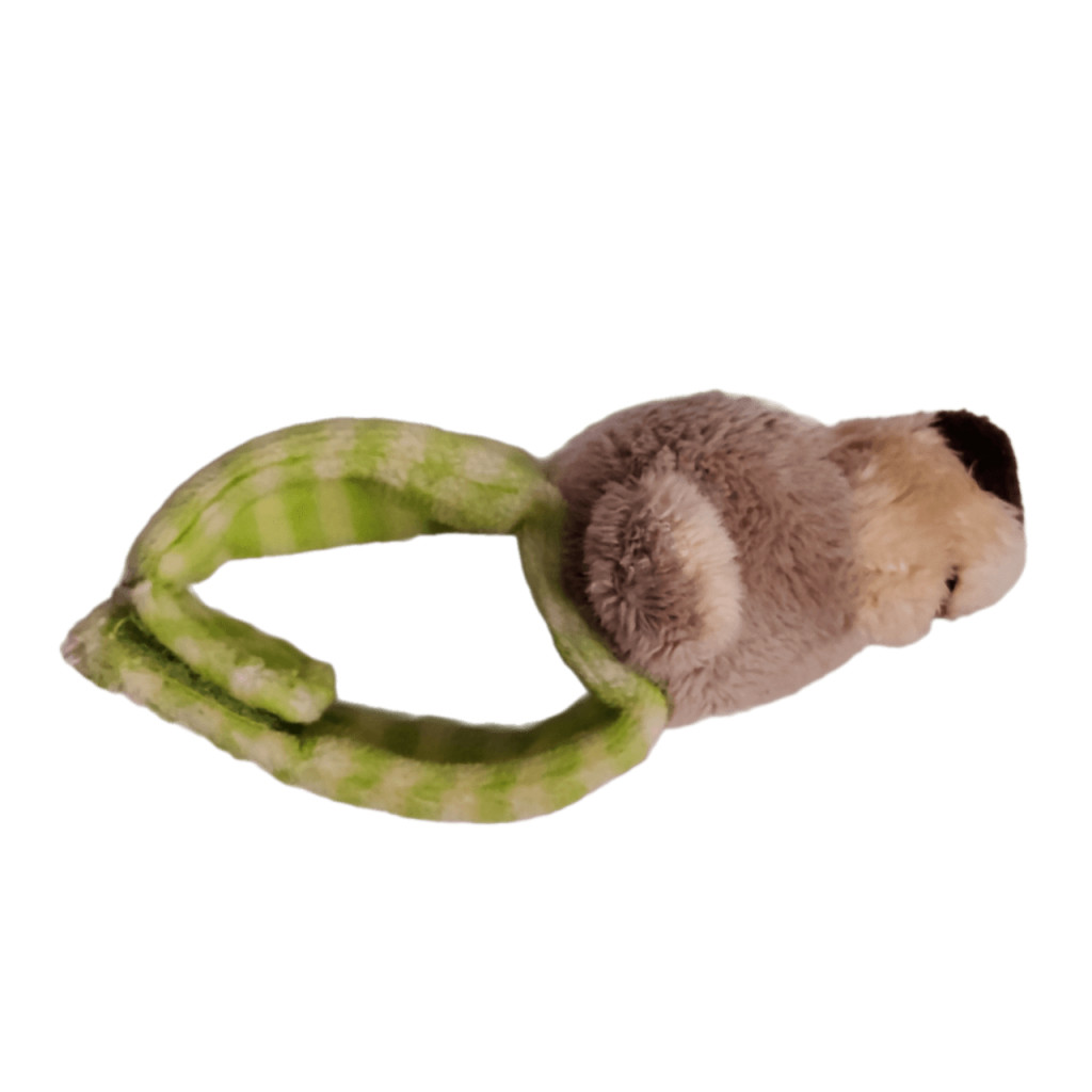 Puha plüss anyagból készült mackó fej, zöld-fehér csíkos pánttal.