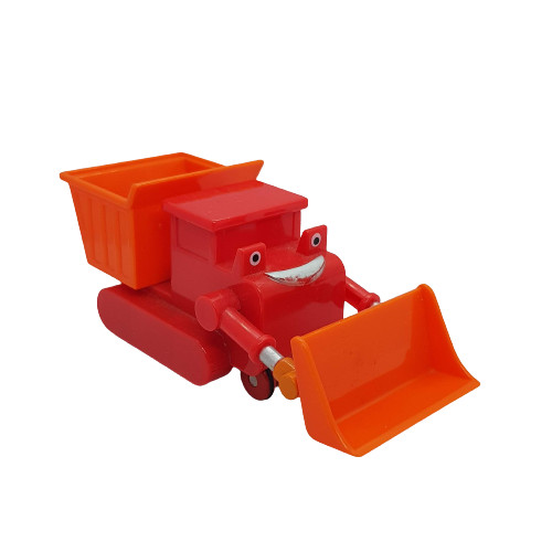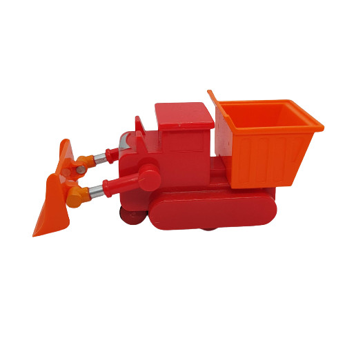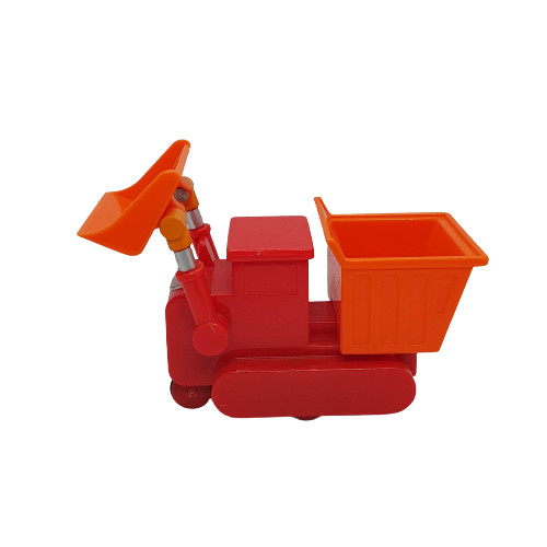 A piros színű markoló szeret intézkedni az építkezésen, szorgosan dolgozik, hordja az építkezési anyagokat.
