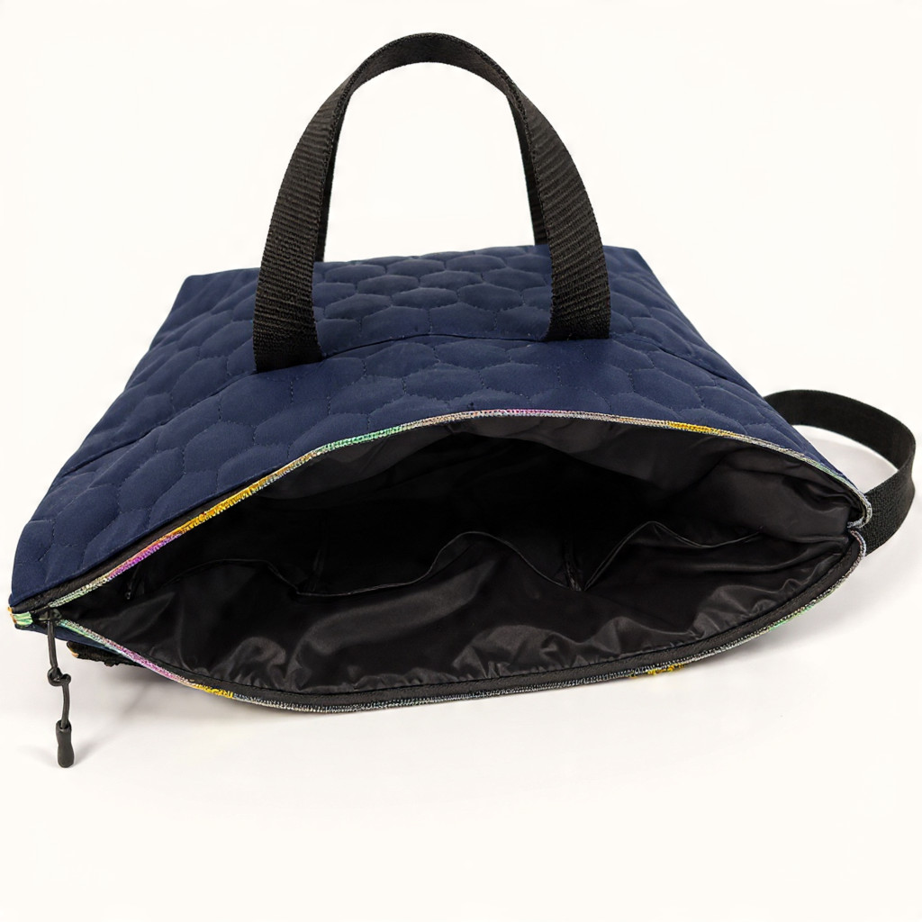 Stílusos és praktikus társ a hétköznapokra. Ez a kézzel készült kézitáska kívül elegáns, sötétkék méhsejt mintás steppelt gyöngyvászonból készült, belül pedig fekete selyem bélés fogad.